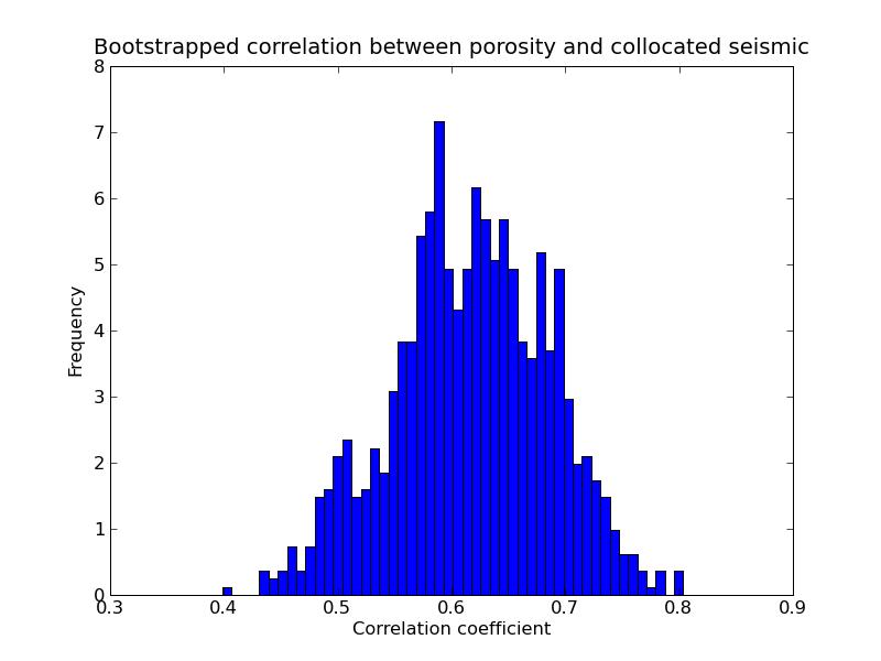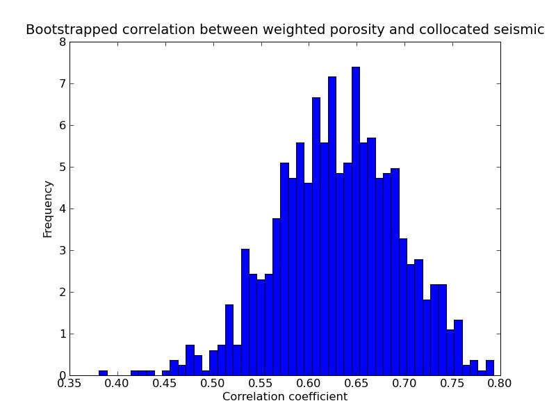 b) Bootstrapped correlation between porosity and collocated seismic: