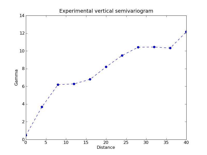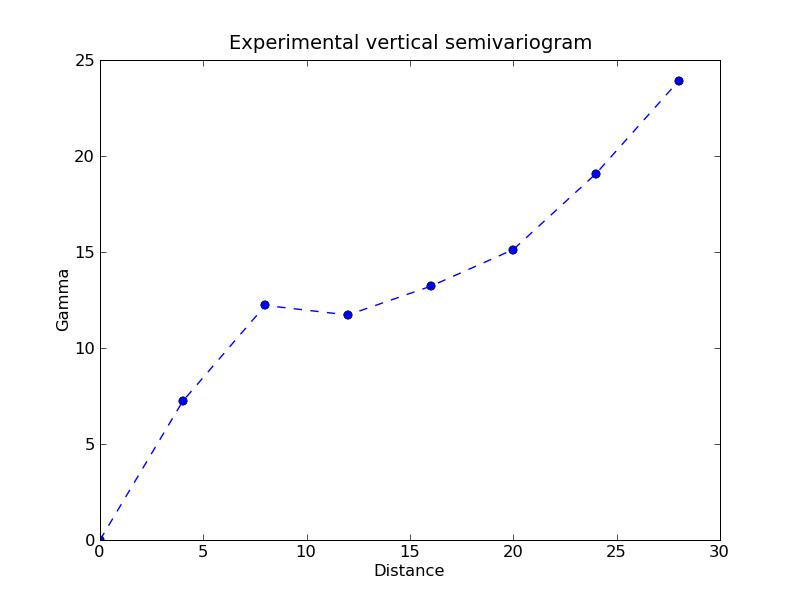 Gamma for vartical semivariogram: [ 0. 0.90357918 1.73293519 2.49416494 3.19286442