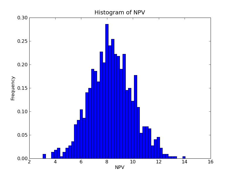 c) Histogram of simulated NPVs: